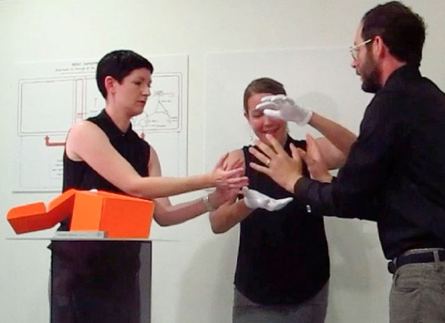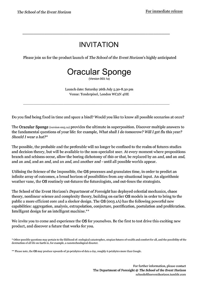 Oracular Sponge (version 003.1a), 2014 For the exhibition "before breakfast we talked about the furthest visible point before it all disappeared" at Tenderpixel, London, the School of the Event Horizon designed, advertised and launched a fictitious time-granulation device, called the Oracular Sponge (version 003.1a). The gallery displayed a packaging design for the product, alongside a press release advertising its launch. At a closing event, the School gave a product demo, ceremonially unboxing the product (made of thin air), and describing its form and functions using hand gestures.